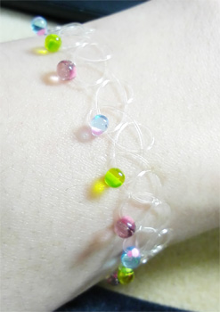昔はテグスだけでしたが、棚をのぞいたら、中途半端に余ったドロップビーズがあったので、それも編みこんでみました。